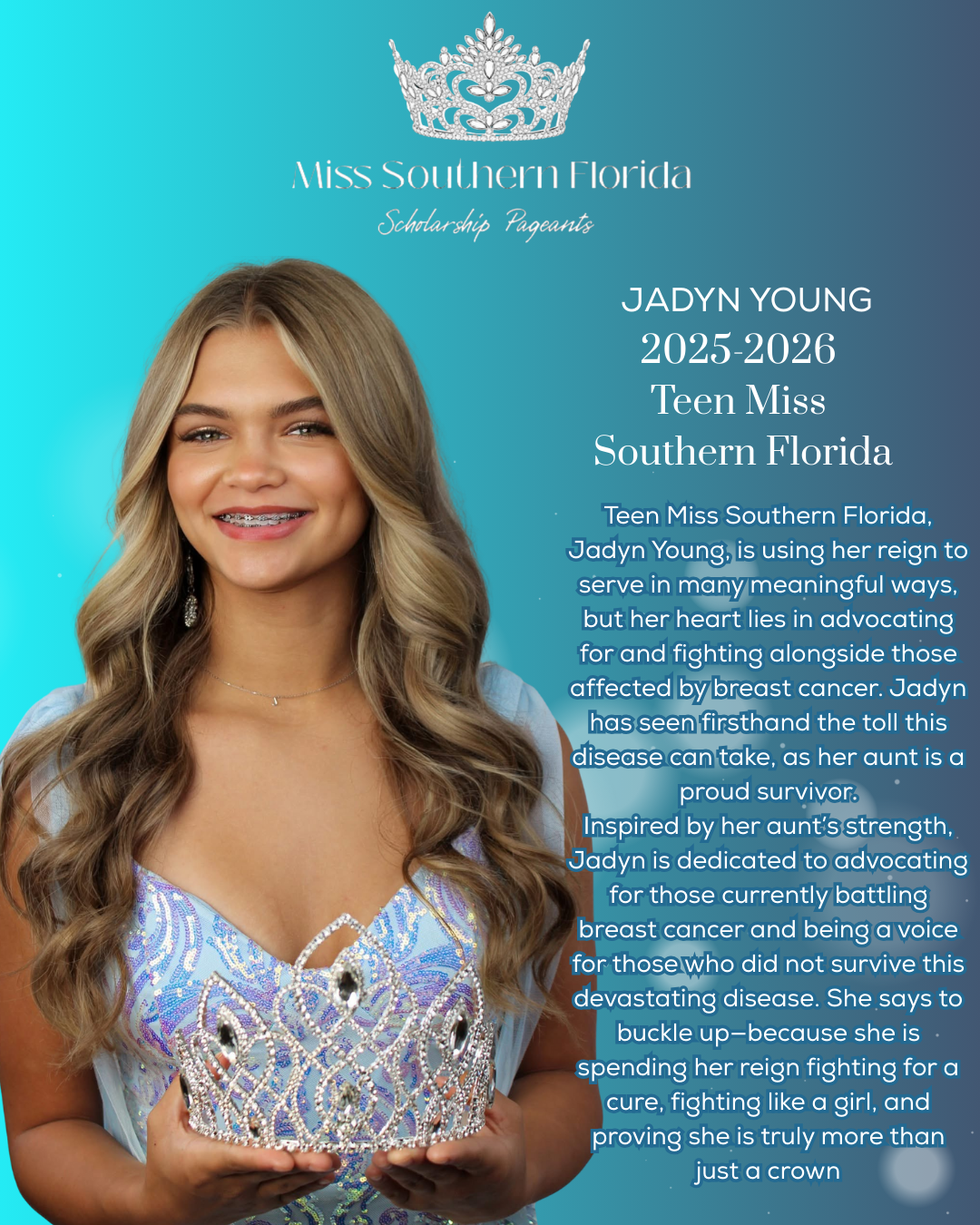 Each Teen Miss and Miss contestant will choose a cause close to her heart—whether it’s mental health awareness, bullying prevention, cancer support, or another issue—and advocate for it throughout her reign.