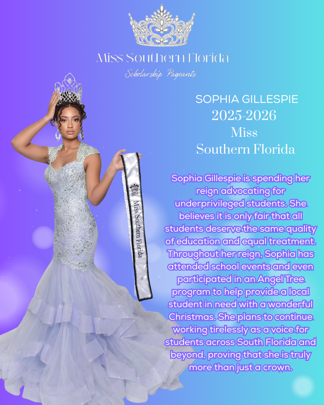 While we’ll always love a sparkly crown, there’s something far more meaningful at the heart of pageantry. At Miss Southern Florida, More Than a Crown is what sets us apart. It’s not just about the sash, the crown, or the trophies—it’s about purpose, passion, and making a lasting impact.